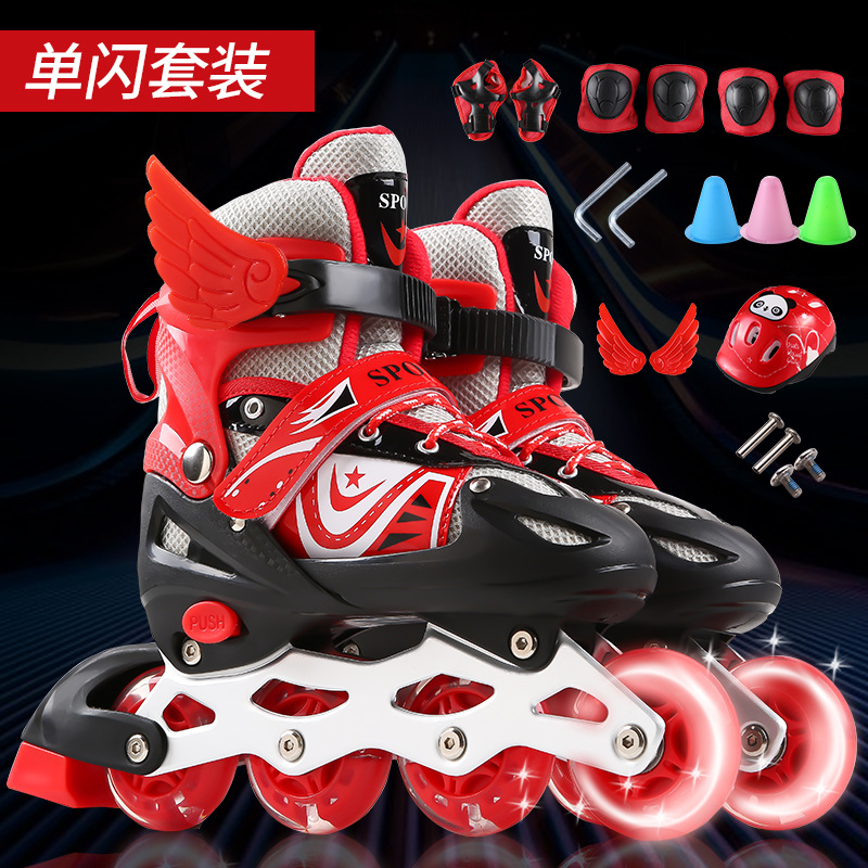 套装配置:前轮闪光鞋子一双、小扳手一对、高密度泡沫头盔一个,护具6件套(含护膝2 护肘2 护掌2),送螺丝一副,翅膀一对,路障3个。