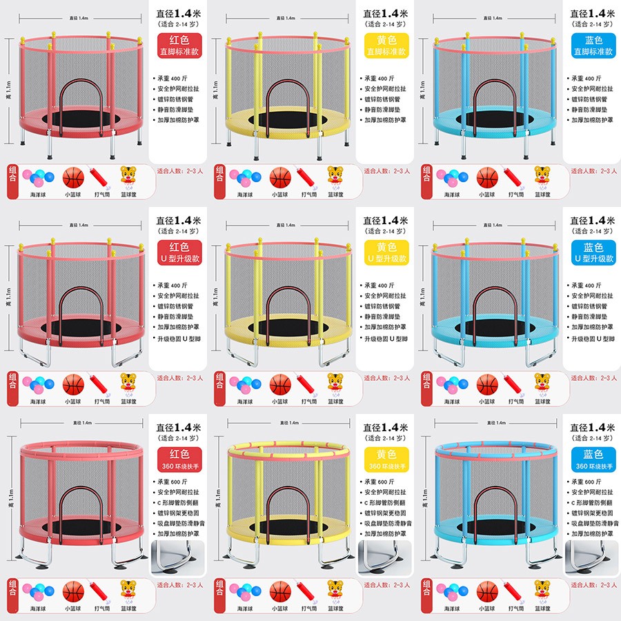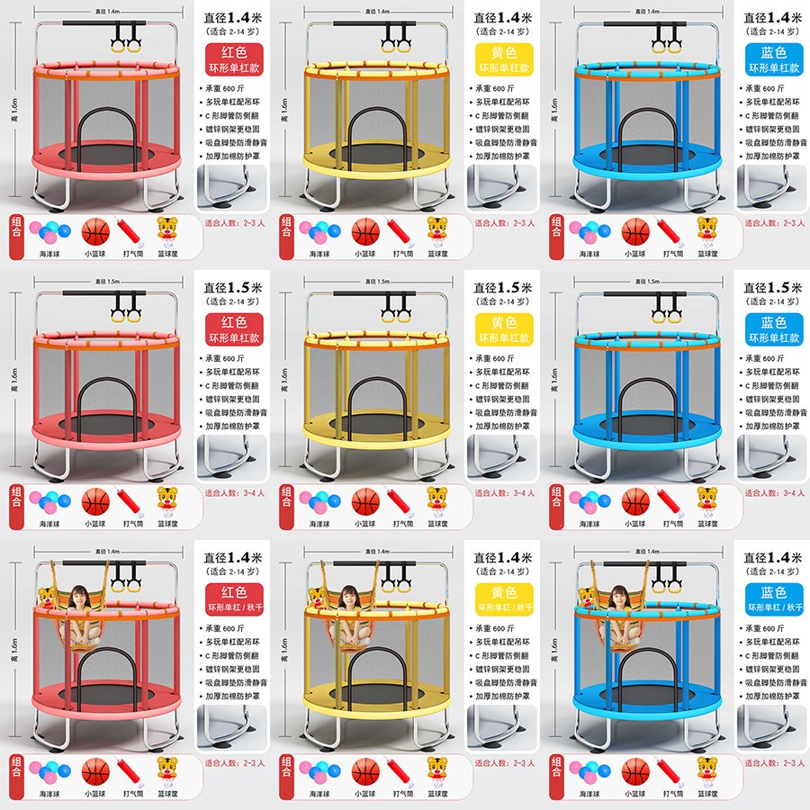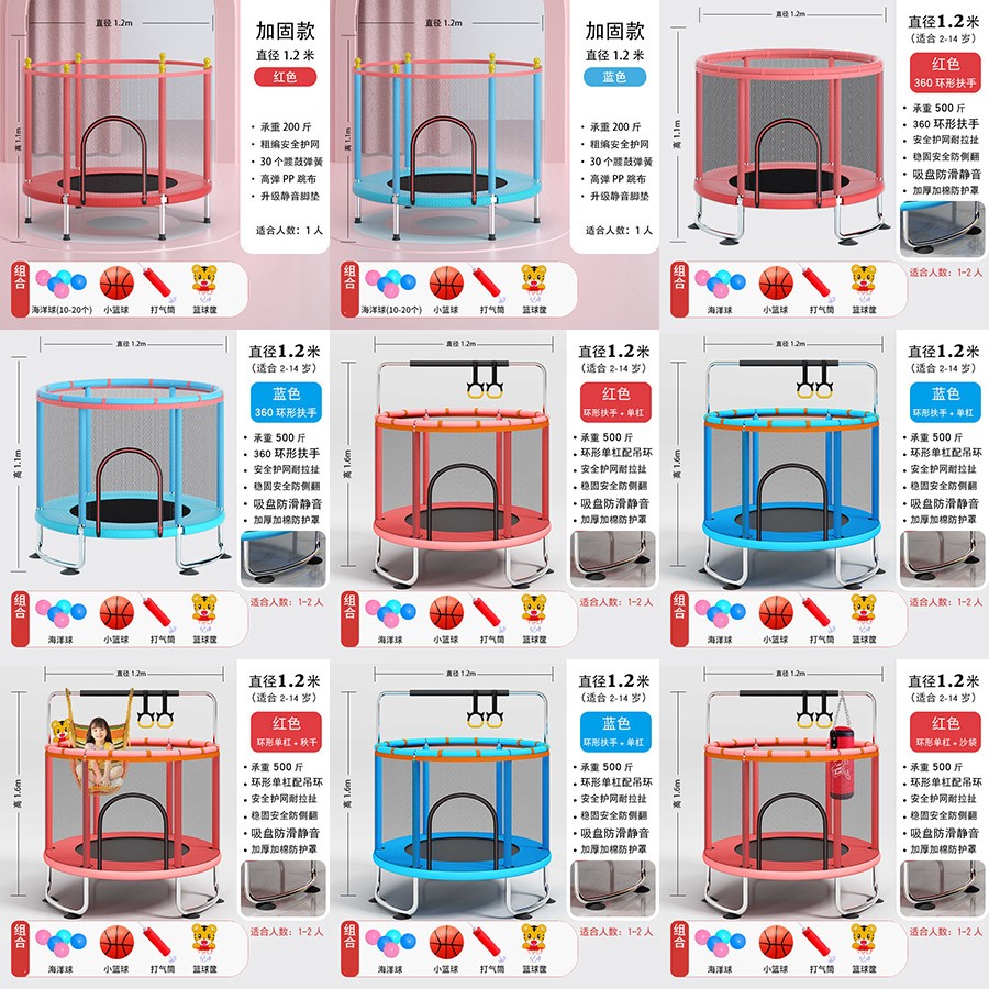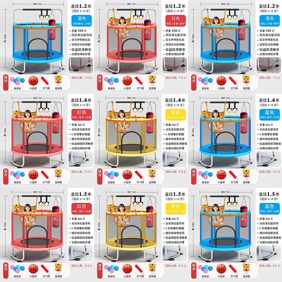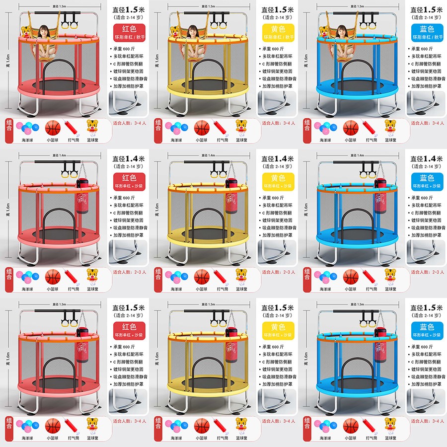 直径1米直腿基础款-红色(90.00),直径1.2米直脚升级加棉款-红色/蓝色(119.00),直径1.4米直脚升级加棉款-红色/黄色/蓝色(125.00),直径1.4米U型脚升级加棉款-红色/黄色/蓝色(135.00),直径1.2米环形扶手款-红色/蓝色(195.00),直径1.4米环形扶手款-红色/黄色/蓝色(205.00),直径1.2米环形单杠款-红色/蓝色(215.00),直径1.4米环形单杠款-红色/黄色/蓝色(225.00),直径1.5米环形单杠款-红色/黄色/蓝色(235.00),直径1.2米环形单杠+秋千-红色/蓝色((225.00),直径1.4米环形单杠+秋千-红色/黄色/蓝色(235.00),直径1.5米环形单杠+秋千-红色/黄色/蓝色(245.00),直径1.2米环形单杠+沙袋-红色/蓝色(225.00),直径1.4米环袋形单杠+沙袋-红色/黄色/蓝色(235.00),直径1.5米环形单杠+沙袋-红色/黄色/蓝色(245.00),直径1.2米环形单杠+秋千/沙袋-红色/蓝色(235.00),直径1.4米环形单杠+秋千/沙袋-红色/黄色/蓝色(245.00),直径1.5米环形单杠+秋千/沙袋-红色/黄色/蓝色(255.00)