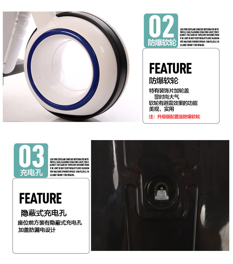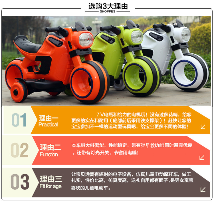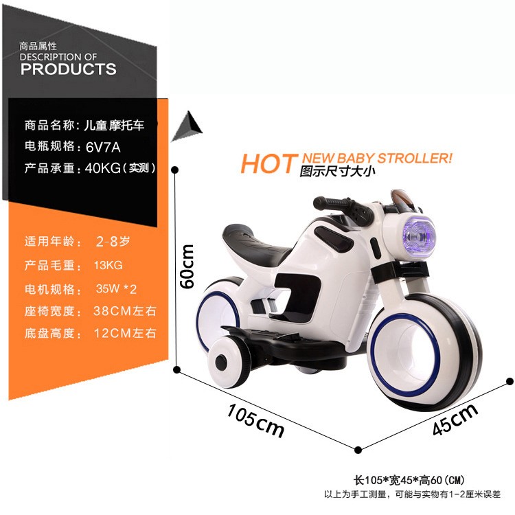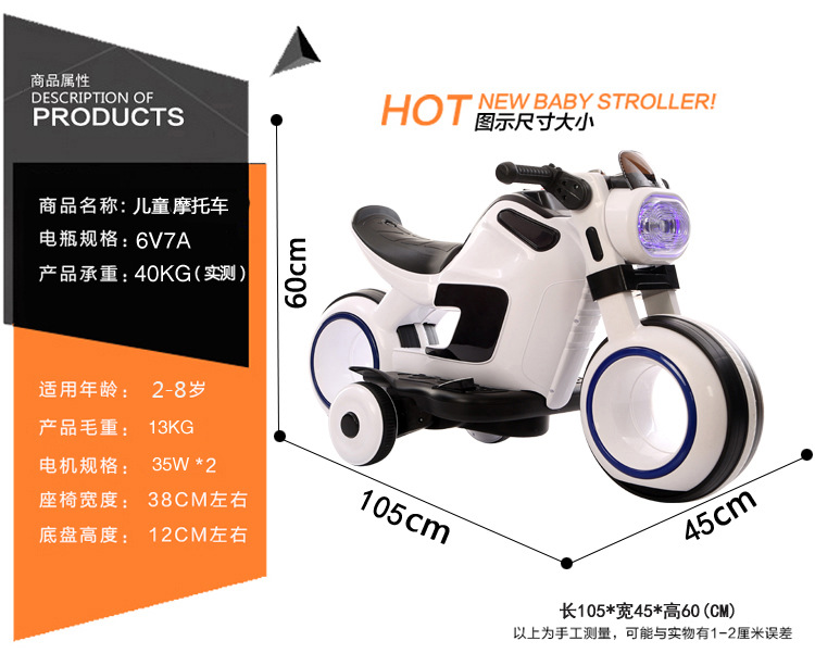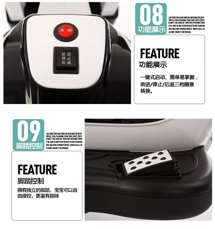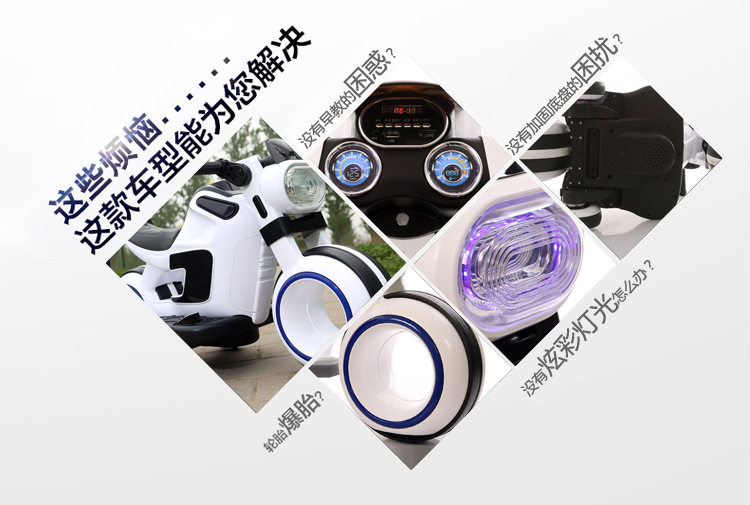 产品介绍:一键启动,电量显示,早教功能,英语故事,LED大灯,USB插口,MP3插口,380双电机,6V7AH电瓶