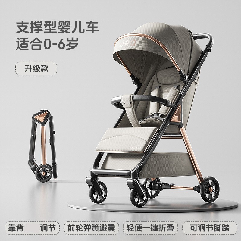 加厚加固的铝合金框架,防侧翻设计,一键式折叠,五点式安全带,加宽座椅,一脚刹车,真皮手柄,拉力绒面料,铝管材料采用氧化工艺,可调靠背,耐磨EVA发泡轮胎,前轮6寸,后轮8寸。