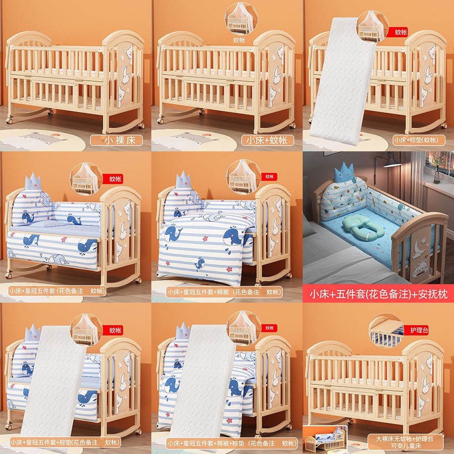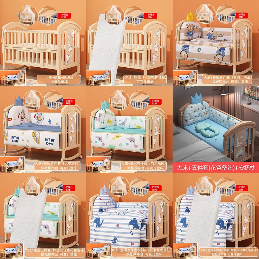 (花色备注):小床(无蚊帐)(365.00),小床+蚊帐(415.00),小床+蚊帐+棕垫(494.00),小床+五件套(506.00),小床+五件套+棉被(585.00),小床+五件套+安抚枕(551.00),小床+棕垫+五件套(585.00),小床+五件套+棕垫+棉被(698.00),大床(无蚊帐)(427.00),大床+蚊帐(461.00),大床+蚊帐+棕垫(574.00),大床+皇冠小老虎/太空旅行/恐龙乐园(551.00),大床+五件套+安抚枕(630.00),大床+棕垫+五件套(664.00),大床+五件套+棉被(664.00),大床+五件套(766.00)