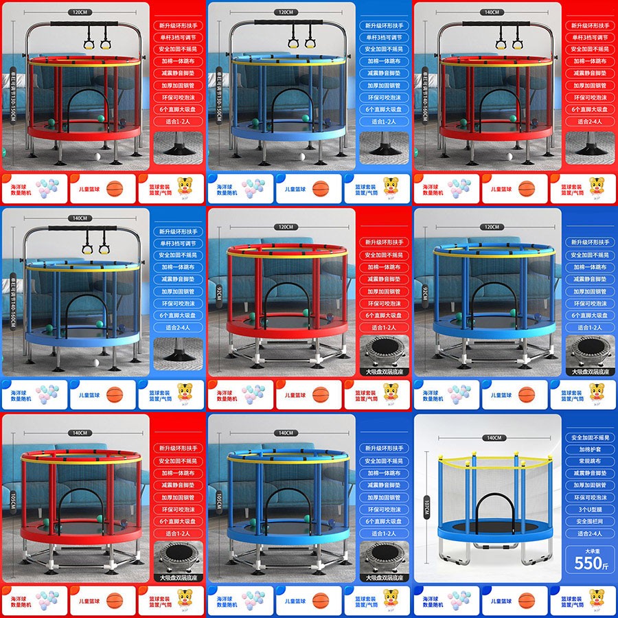 2022特惠1.2米红+环形+吸盘,2022特惠1.2米蓝+环形+吸盘,2022特惠1.4米红+环形+吸盘,2022特惠1.4米蓝+环形+吸盘,新三代1.2米红+大吸盘双层底座,新三代1.2米蓝+大吸盘双层底座,新三代1.4米红+大吸盘双层底座,新三代1.4米蓝+大吸盘双层底座,新五代滑梯蹦床1.4红+大吸盘双底座,新五代滑梯蹦床1.4蓝+大吸盘双底座,新四代滑梯蹦床1.2红+大吸盘双底座,新四代滑梯蹦床1.2蓝+大吸盘双底座,第二代1.4米红+环形扶手+吸盘,第二代1.4米蓝+环形扶手+吸盘,第二代1.2米蹦床+常规跳布,第二代1.4米红色+加棉护套U型,第二代1.4米红色+加棉护套直脚,第二代1.4米蓝色+加棉护套U型,第二代1.4米蓝色+加棉护套直脚。