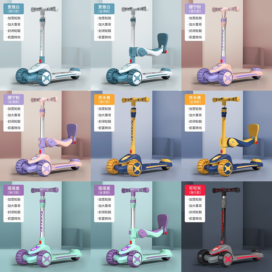 滑行款(103.00),坐滑款(123.00),滑行小轮款(93.00),坐滑小轮款(113.00)。 颜色:素雅白,樱宁粉,奈黄色,塔塔紫,可可灰