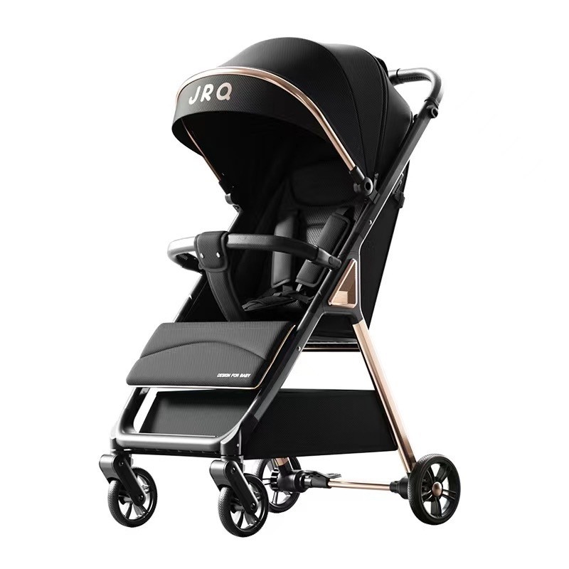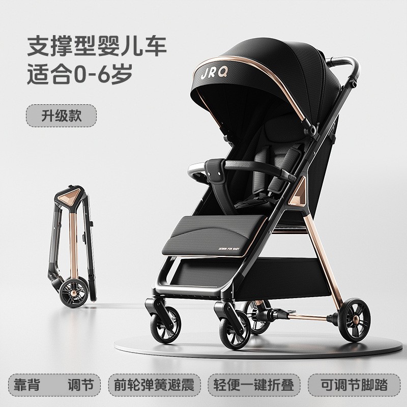 加厚加固的铝合金框架,防侧翻设计,一键式折叠,五点式安全带,加宽座椅,一脚刹车,真皮手柄,拉力绒面料,铝管材料采用氧化工艺,可调靠背,耐磨EVA发泡轮胎,前轮6寸,后轮8寸。